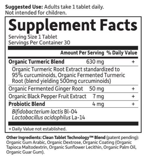 Other Ingredients: Clean Tablet Technology™ Blend (patent pending), Organic Gum Arabic, Organic Dextrose, Organic Coating (Organic Sunflower Lecithin, Organic Tapioca Maltodextrin, Organic Palm Oil, Organic Guar Gum).