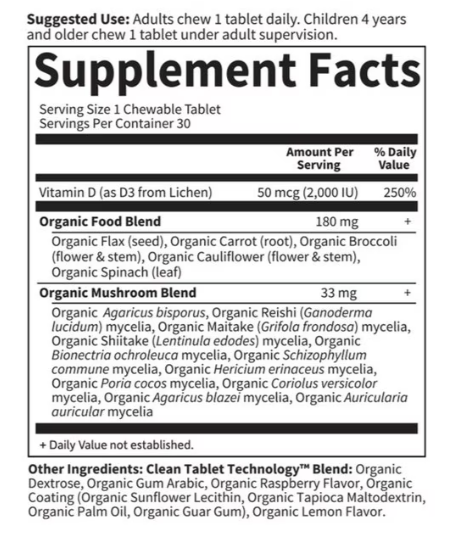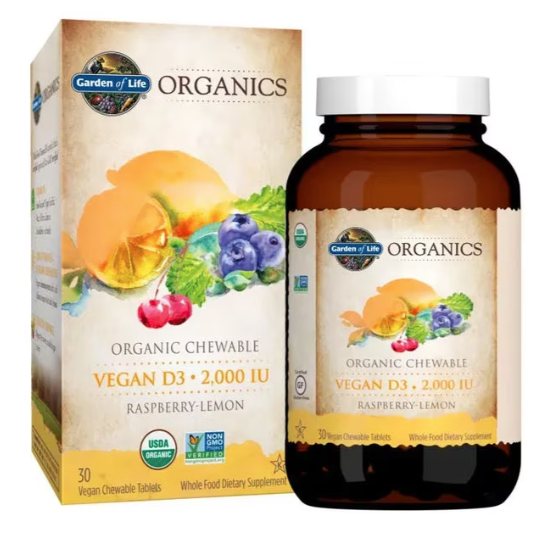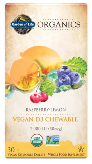 Garden of Life Organics Vegan D3 is a delicious raspberry-lemon whole food, vegan vitamin D3 chewable that is both Certified USDA Organic and Non-GMO Project Verified. Garden of Life Organics Vegan D3 chewable offers a potent and active form of vitamin D (cholecalciferol) for the body—because that is what the body naturally produces after sun exposure. While many vegetarian vitamin D supplements are vitamin D2 (ergocalciferol), this one is cholecalciferol. Furthermore, many vitamin D supplements are made from oily fish or from sheep lanolin, the waxy substance secreted by glands in sheep skin. Obviously, those won’t work for those following a vegan lifestyle. This great vitamin D supplement is for everyone, but vegans and vegetarians are particularly at high risk for coming up short on vitamin D, since some of the best sources of vitamin D—other than sunlight—come from animal sources. This D3 chewable also supports immune system health as well as calcium absorption for healthy bones.*
