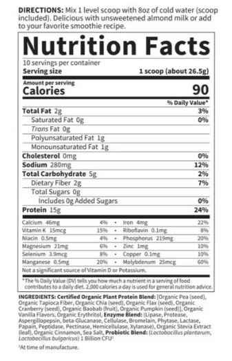 [Organic Pea (seed), Organic Tapioca Fiber, Organic Chia (seed), Organic Flax (seed), Organic Cranberry (seed), Organic Baobab (fruit), Organic Pumpkin (seed), Organic Vanilla Flavors, Organic Erythritol, Organic Stevia Extract (leaf), Organic Cinnamon, Sea Salt, RAW Enzyme Blend: Lipase, Protease, Aspergillopepsin, beta-Glucanase, Cellulase, Bromelain, Phytase, Lactase, Papain, Peptidase, Pectinase, Hemicellulase, Xylanase, RAW Probiotic Blends: [Lactobacillus Plantarum, Lactobacillus Bulgaricus] 1 Billion CFU