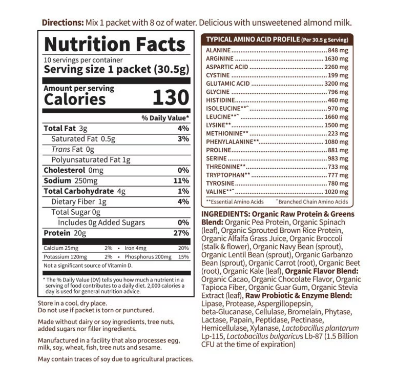 Ingredients: Organic raw protein and greens blend: organic pea protein, organic spinach (leaf), organic sprouted brwon rice protein, organic alfalfa grass juice, organic broccoli (stalk and flower), organic navy bean (sprout), organic lentil bean (sprout), organic garbanzo bean (sprout), organic carrot (root), organic beet (root), organic kale (leaf)
